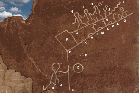 The large human figure on the left is the Great Spirit. The bow in his left hand represents his instructions to the Hopi to lay down their weapons. The vertical line to the right of the Great Spirit is a time scale in thousands of years. The point at which the great Spirit touches the line is the time of his return.